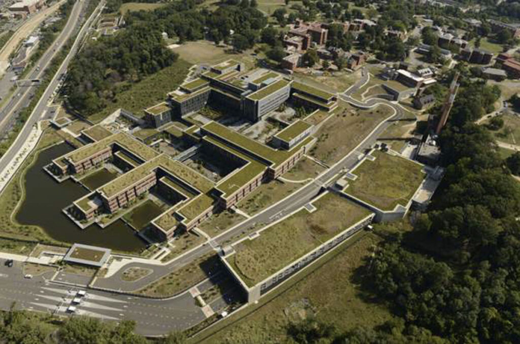 Figure 2. Aerial view of U.S. Coast Guard Headquarters. XPS insulation must resist compressive loads from the weight of vegetative or “green” roofs. Note: The appearance of U.S. Department of Defense (DoD) visual information does not imply or constitute DoD endorsement. EPS = expanded polystyrene; XPS = extruded polystyrene.