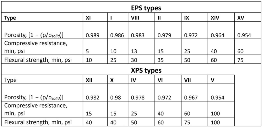 Table 1. Calculated total porosity of “XPS types” and “EPS types” of rigid, cellular polystyrene insulation based on ASTM C578 minimum density values.