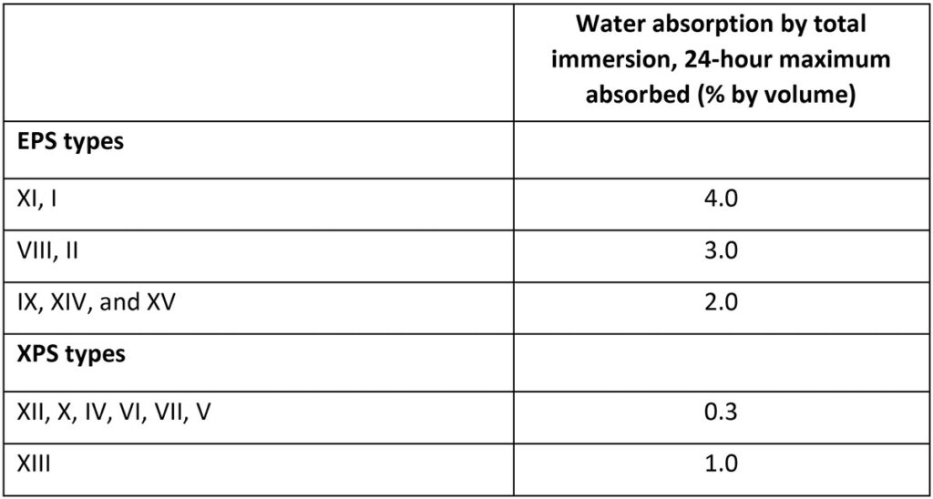 Table 1. Water absorption for various “EPS types” and “XPS types” of rigid, cellular polystyrene insulation.