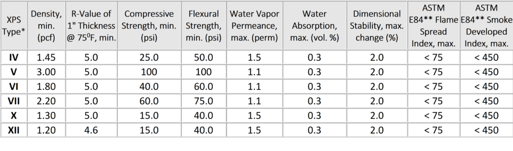 ASTM C578 includes a table of physical property requirements for several Types of XPS (and EPS) foam insulation boards. For example, Type IV XPS is required to demonstrate a minimum compressive strength of 25 psi, whereas Type VII XPS requires a minimum 60 psi compressive strength. The table below is recreated, in part, to show only XPS information listed in the more complete table of ASTM C 578. ASTM C578 is a copyrighted document, so please obtain the actual standard from ASTM for more complete information pertaining to this table and the test methods required to be used to evaluate performance.
